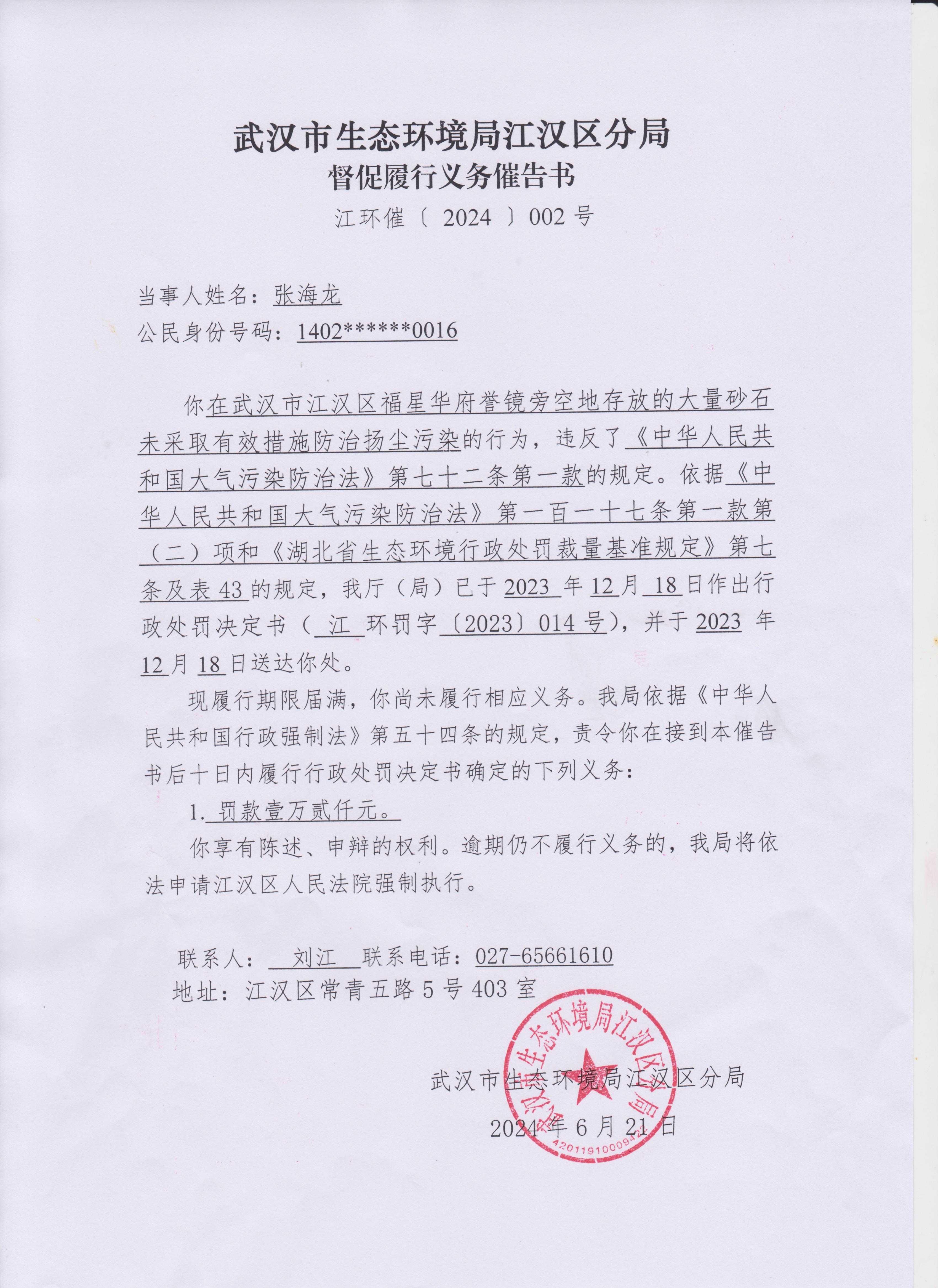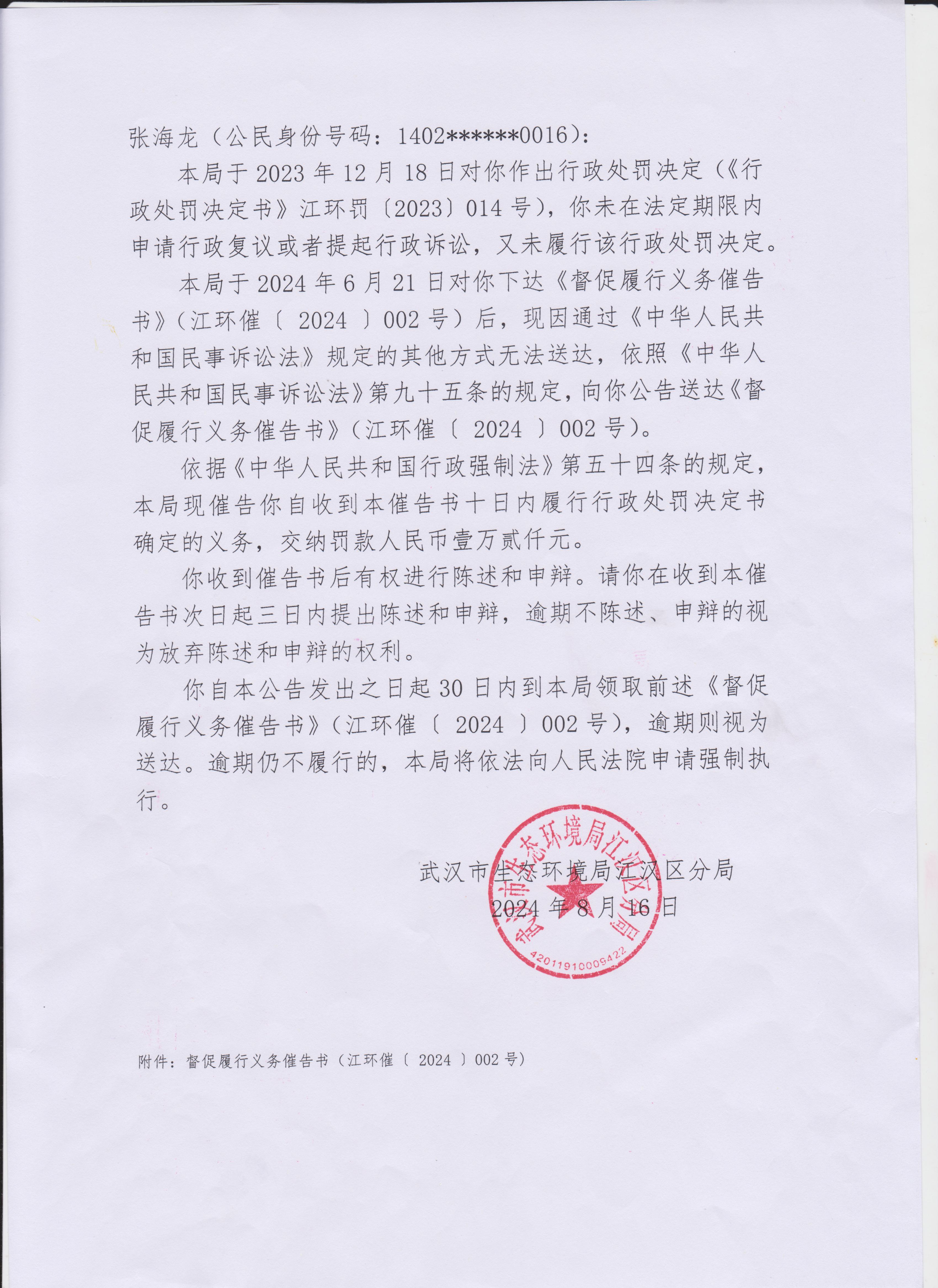 | 标 题 | 武汉市生态环境局欧亚国际(中国)官方网站 分局督促履行义务催告书(江环催[2024]002号)公告送达 | ||