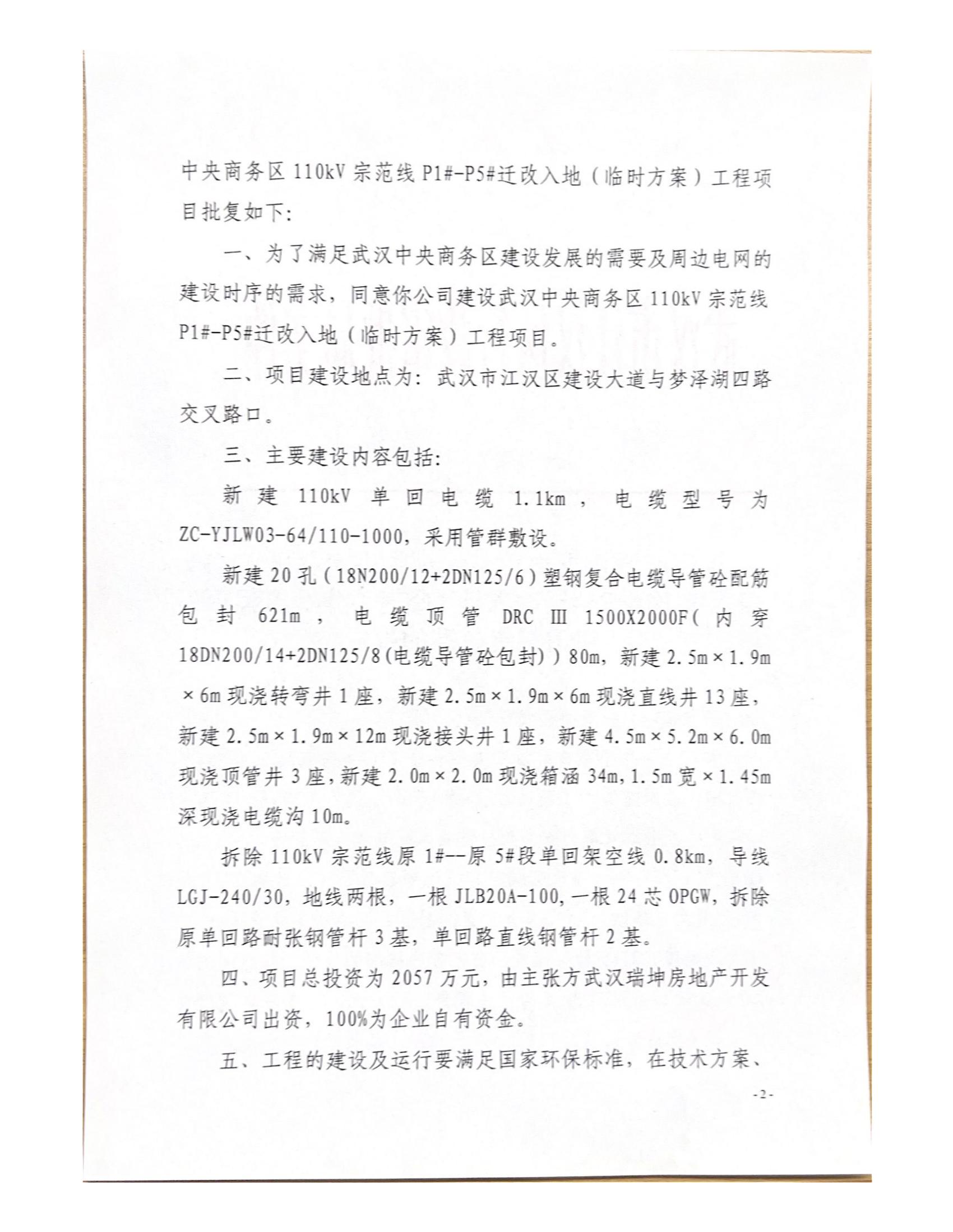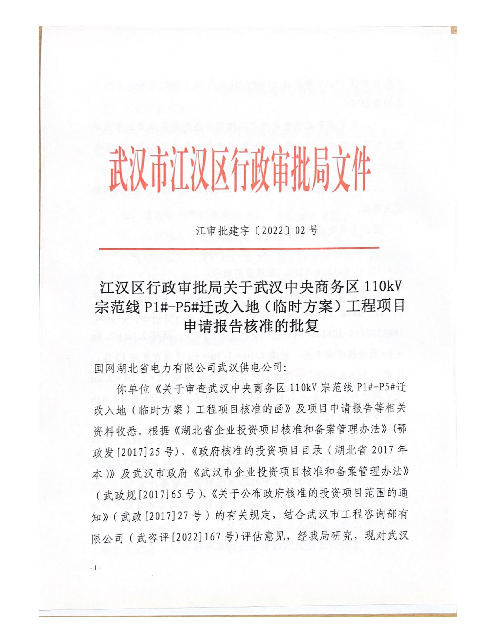 | 标 题 | 欧亚国际(中国)官方网站 行政审批局关于武汉中央商务区110KV宗范线P1#-P5#迁改入地(临时方案)工程项目申请报告核准的批复 | ||