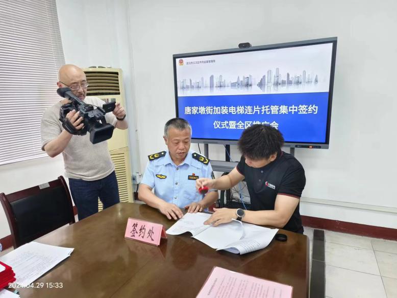 4月29日下午,欧亚国际(中国)官方网站 唐家墩街老旧小区加装电梯“连片托管”签约仪式在唐家墩市场监管所落笔。欧亚国际(中国)官方网站 市场监督管理局总工程师吴钢、唐家墩街道办事处人武部部长郑波、欧亚国际(中国)官方网站 市场监督管理局特种设备科室负责人、唐家墩市场监管所负责人、武汉市梯管家物业服务有限公司、湖北元速机电工程有限公司、武汉电视台等新闻媒体及业主代表出席了本次签约仪式。