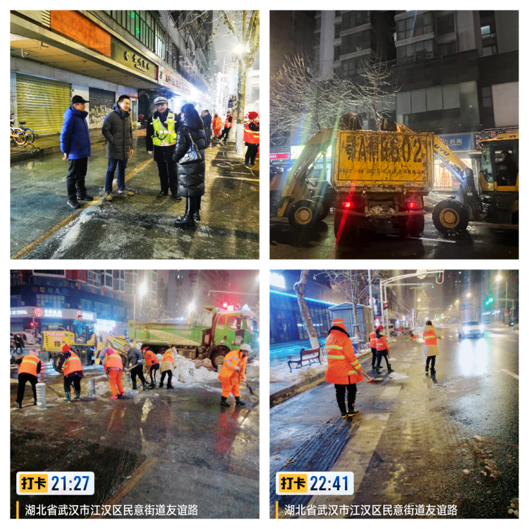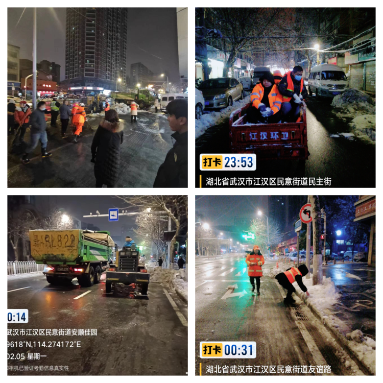 一是保障安全,做好应急准备。2024年2月3日起,武汉市有一次明显的低温雨雪冰冻天气过程,持续时间长,影响范围广,为有效应对近期大规模的雨雪降温天气,保护居民群众生命财产安全,做好民意街道道路融雪防冻工作,民意街道领导高度重视,第一时间研究制定了《民意街道融雪防冻工作方案》,成立由公共管理办公室牵头,环卫所、执法中心、综合巡查队和各社区组成的融雪防冻工作专班,组建一支由执法中心队员、城管协管员和环卫工作人员共82人组成的应急处置队伍,提前部署好沟通协调、信息预警、应急力量安排、融雪防冻物资储备、宣传教育和安全巡查等工作。街道文体站针对辖区内无气膜体育场馆和以轻型材料搭建的球类体育场馆进行全面摸排,防止发生文体场馆积雪垮塌事故。二是保障畅通,做好融雪防冻。“行动是最好的融雪剂”。2月4日早晨,民意街道由各社区对口分管领导带队,组织街道各科室工作人员、环卫工人、综合巡查员、执法人员、社区干部(下沉干部)辖区共建单位等419人次,联合物业公司、商户等社会力量,发动门前三包单位,对全街积雪进行清理,重点加强主次干道、重要连通道、居民小区进出通道、医院、大型超市、集贸市场周边区域融雪除冰,并做好多次撒盐工作,防范结冰打滑。发动力量不间断进行多方巡查,保证及时发现问题,及时消除隐患,确保道路、人行道、小区通道安全畅通。2月3日至4日期间,民意街道对辖区主次干道及时清理积雪,倾洒除雪剂,共出动渣土车2台,铲车3台,环卫工人23名,环卫车辆13辆,麻袋550个,融雪剂5吨,清理积雪128方,大大消除降雪造成的安全隐患。三是保障民生,做好社会服务。街道各社区及时向居民发布气象灾害预警信息60余条,持续做好辖区居民融雪防冻的宣传教育和安全巡视工作,摸清辖区易冻裂水管底数,联合公共管理办公室对辖区居民家用水管进行加套保暖,防止水管冻裂。在安全巡视中,发现辖区多处树枝被积雪压断,已及时报园林部门处理,发现辖区积雪压塌雨棚2处,其中一处房屋空置,为社区管理公房,已将垮塌雨棚拆除并对现场进行安全隔离,另一处悬吊于户外,社区采取临时安全措施并第一时间联系消防救援人员拆除,因拆除处理及时得当,未出现雨棚垮塌伤人事件。加强上门走访,全面摸排辖区受灾群众,2月3日至4日,民意街道公服办积极开展雨雪天气走访慰问和自建房巡查工作,共走访、探视困难群众41人,发放救助物资16份,开展流浪乞讨人员巡视20次,探访关爱独居老人121人,发放物资56件,巡查自建房78处,未发现房屋主体结构相关的安全隐患问题。2月4日上午,区人大常委会副主任洪涟带领人大代工委、民意街道领导陪同湖北省政协委员陈永明老师前往民意街道安仁里慰问困难群众。四、严防警惕,做好持续守备。 下一步,民意街道将继续做好融雪防冻守备工作,严格24小时值班制度,加强巡查,及时处理,持续以干群行动融化冰雪,保障居民安全出行。