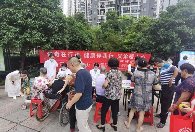汉兴社区卫生服务中心医护人员为居民量血压、测血糖、讲健康知识,给居民提供健康指导建议,让居民 在家门口享受“一站式”健康服务。